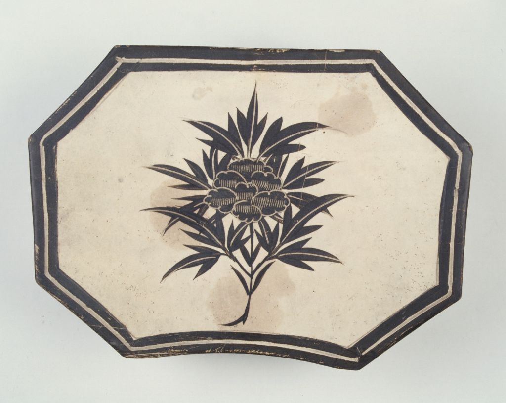 枕八方形,面、底出沿,外壁各面转角处均有一道八节竹子状凸棱。背面有一通气孔,素底无釉。枕面周边描绘黑彩边框,中心以黑彩描绘折枝牡丹一枝,并在花瓣、花叶上以尖状工具划掉黑彩,呈现出白色的筋脉。
