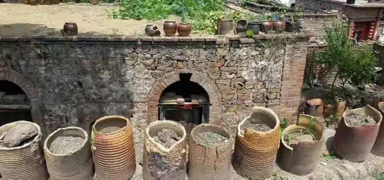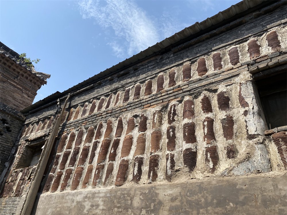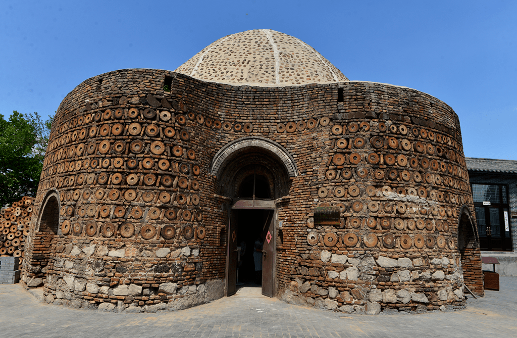 在彭城古镇街头,随处可见使用笼盔的建筑。笼盔的垒法颇有讲究:院落围墙多以竖式垒建,配以砖石,缝隙处抹上石灰等黏合剂,便形成了一堵坚固、保温而又美观的墙壁。建造窑炉时,由于窑壁较厚,笼盔多以卧式垒建,笼盔头朝外,圆形图案配上古铜的色调,犹如一圈圈岁月的年轮,从中可窥见古镇的往昔。