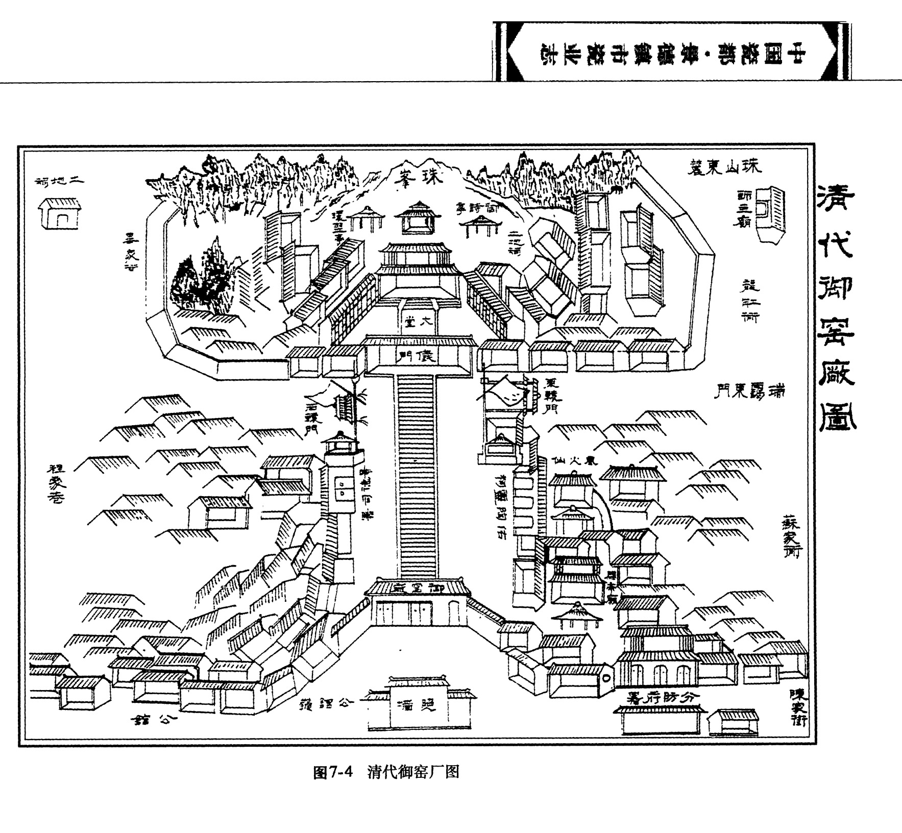 御窑厂 清顺治十一年(1654)恢复官窑生产,始改御窑厂,建制仍沿袭明代,御窑厂匠作人员,对“自有上工夫派饶州属邑者悉罢之”,而二十三作之分工,却只有名称上稍微变更。御窑厂平时只存少数额定人员(约二、三十人),无编役,采用了以金钱雇佣劳动力的方式,故各作人数不定,雇佣工匠的人数,视工作繁而临时雇请。在内容将碗、盘、杯碟改为大器、小器,仿古和雕塑。御窑厂由督准官吏、九江官吏巡领,并派员驻厂协助,以后由朝廷直接委派官吏驻厂督造,以督陶官姓氏冠首窑名,有康熙年臧(减应选)窑、郎(郎廷极)窑,雍正年间的年(年希尧)窑,乾隆年间的唐(唐英)窑。自雍正六年迄十三年的七年之间,“计费帑金数万,而制造圆,琢等器不下三四十万件”,每年平均也在五万件以上,较之明代后期烧制数量并无逊色。为了满足宫廷的需要,不计工本的提高质量和仿制名窑器,创造新品种,促进了陶瓷技术的进步和整个瓷业的发展。唐英在乾隆元年的《陶成纪事碑》中,记载了自雍正六年以后景德德御窑厂的概况:当时每年秋、冬两季向北京上交盘、&P,jiff、钟、碟等上色圆器,由2,3寸口径至2,3尺口径不等,共1万6 , 7千件;瓶、罄、尊、彝等上色琢器,由3,4寸高至3,4尺高不等,共200()余件。上交必须连同不够规格的次品一起,因此实际生产量要超过这个数字。这些产品大约需要3万人左右(包括辅助工和办事人员)完成。每年的总支出是800(〕两银子,由淮安报闸关支付。咸丰五年(1855)御窑厂停办。同治五年(1866) ,朝廷曾派员谋兴复御窑未成。