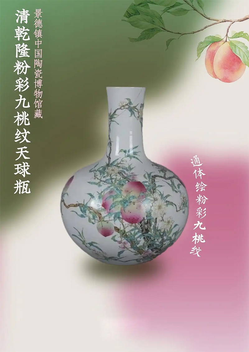 粉彩九桃纹天球瓶(清乾隆) 信息概况 名称:粉彩九桃天球瓶高度:51.5厘米年代:乾隆时期产地:景德镇说明:故宫馆藏 物品图片 物说明 这是一件带有吉祥喜庆之意的高档陈设观赏瓷粉彩瓷是景德镇四大传统名瓷之一以秀丽雅致、粉润柔和见长清代乾隆时期的制瓷技巧达到空前水平造型上以瓶、尊等为主追求精、奇、巧天球瓶造型始于明永乐时期到雍正、乾隆时期再度盛行 赞 笔记 分享 欢迎访问:陶瓷笔记