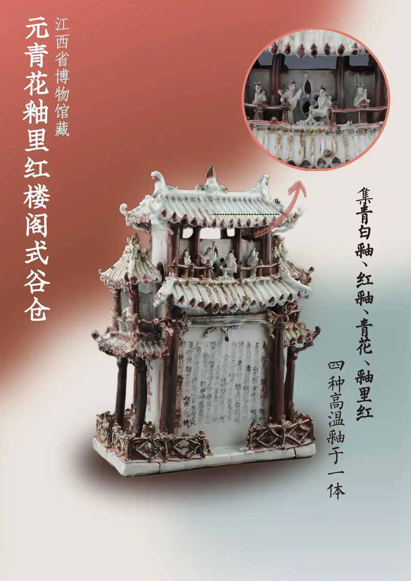 | 这件楼阁式谷仓是元代景德镇瓷业成就的集大成者 是目前仅见的重檐庑殿顶楼阁式谷仓 谷仓有上下二层 楼阁上塑有十余名姿态各异的人物 或手执掌扇,或怀抱琵琶,或甩袖起舞 这件瓷器集青白釉、红釉、青花、釉里红 四种高温釉(彩)于一体,工艺精湛 是目前发现的两件有明确纪年的元代青花釉里红瓷器之一 |