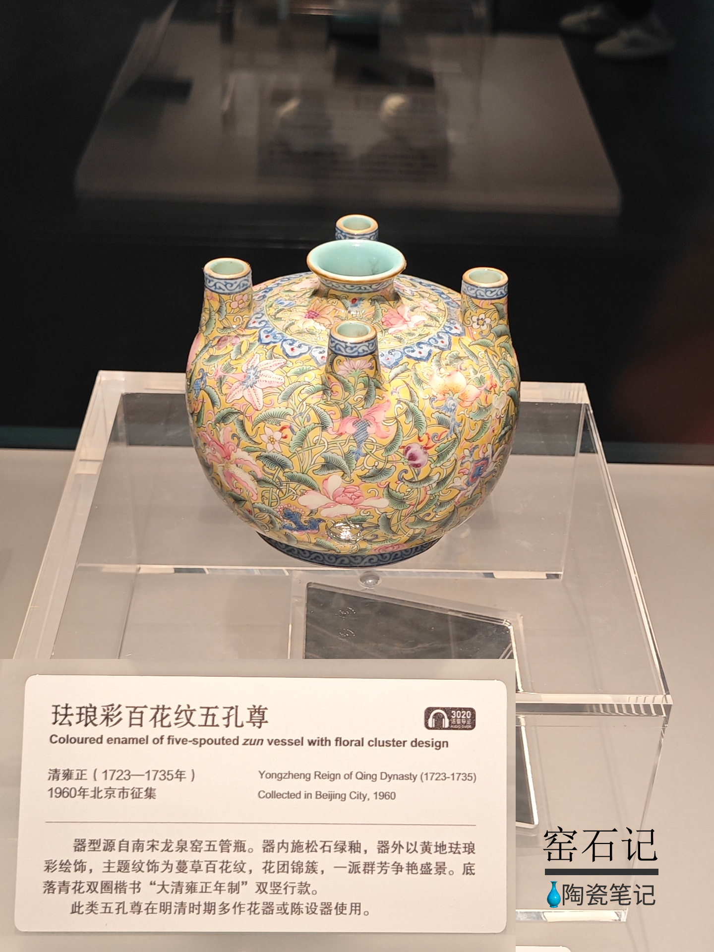器型源自南宋龙泉窑五管瓶。器内施松石绿釉,器外以黄地珐琅彩绘饰,主题纹饰为蔓草百花纹,花团锦簇,一派群芳争艳盛景。底落青花双圈楷书“大清雍正年制”双竖行款。