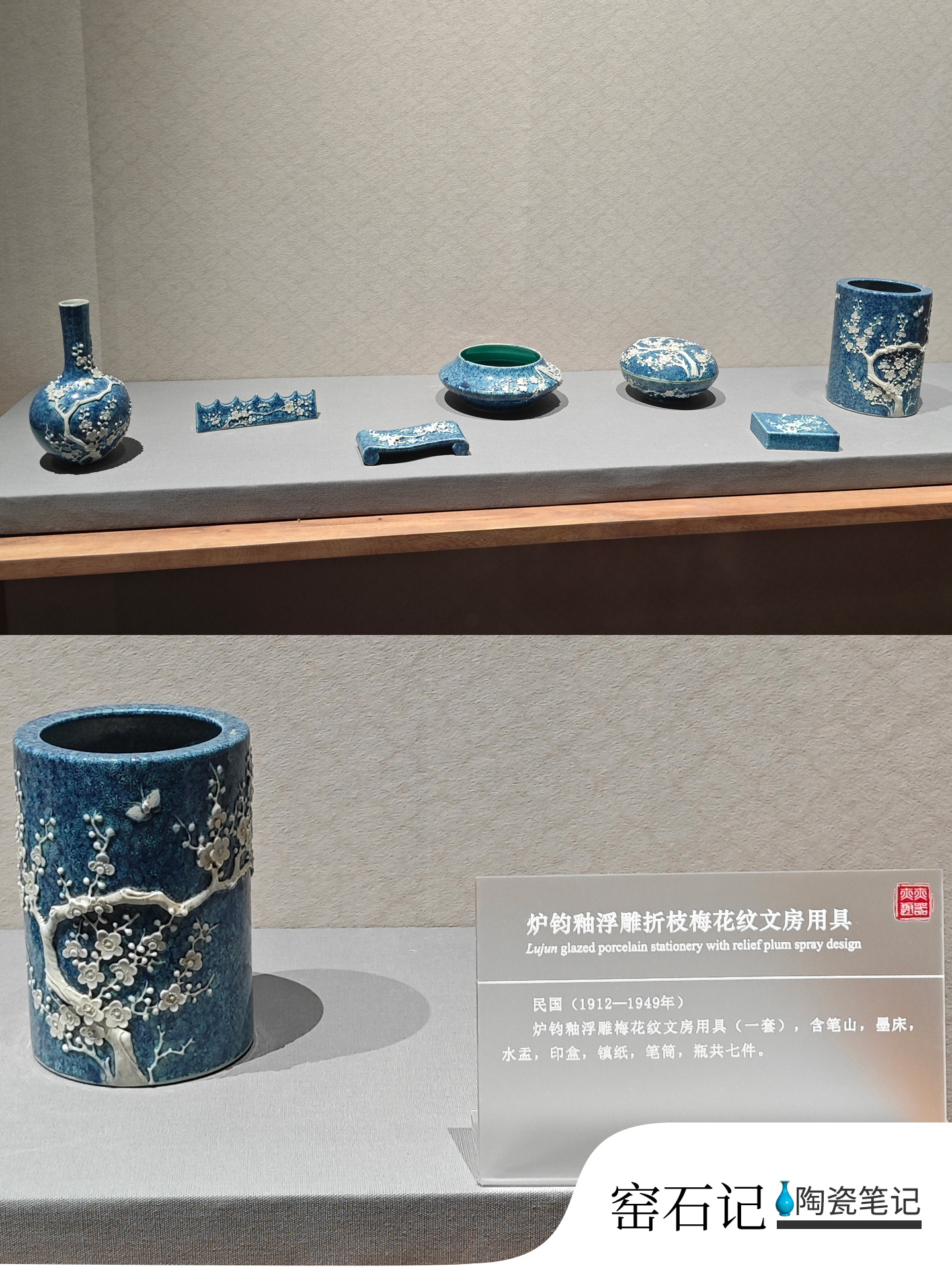 炉钧釉浮雕折枝梅花纹文房用具Lufun glazed porcelain stationery with relief plum spray design
