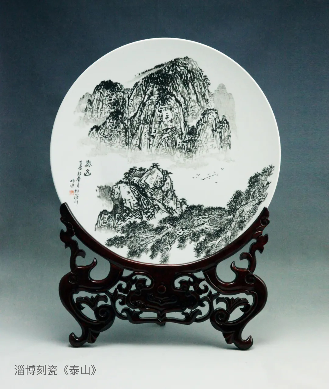 淄博刻瓷《泰山》以“五岳之首”泰山为题材,展现写意山水的笔墨淋漓和刻瓷的金石韵味,寓意国泰民安之下的锦绣河山。