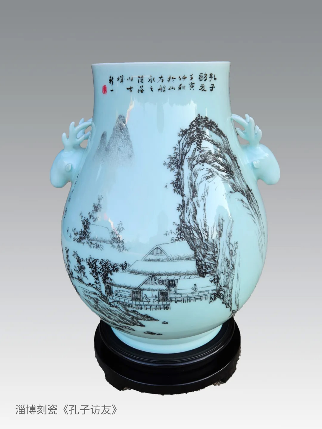 淄博刻瓷《孔子访友》,山东素有“孔孟之乡,礼仪之邦”之称。作品选用孔子访友为题材,用镌刻的刻瓷技法,展现于青山碧水间、苍松翠柏环绕中与友人相聚的盛景,体现了友谊、自由和道德等多重主题,古朴、典雅、庄重之意充分涌流。