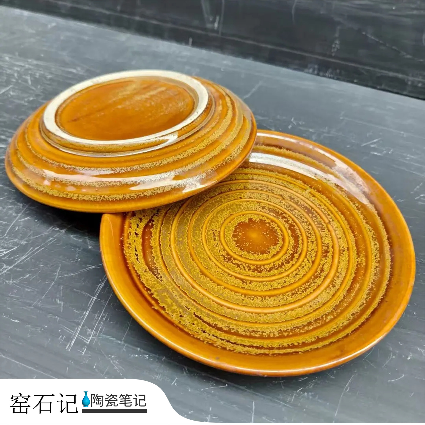 磁州窑陶瓷产品展示,黄金釉碟子,国营厂时期邯郸陶瓷五厂产品,直径15cm。