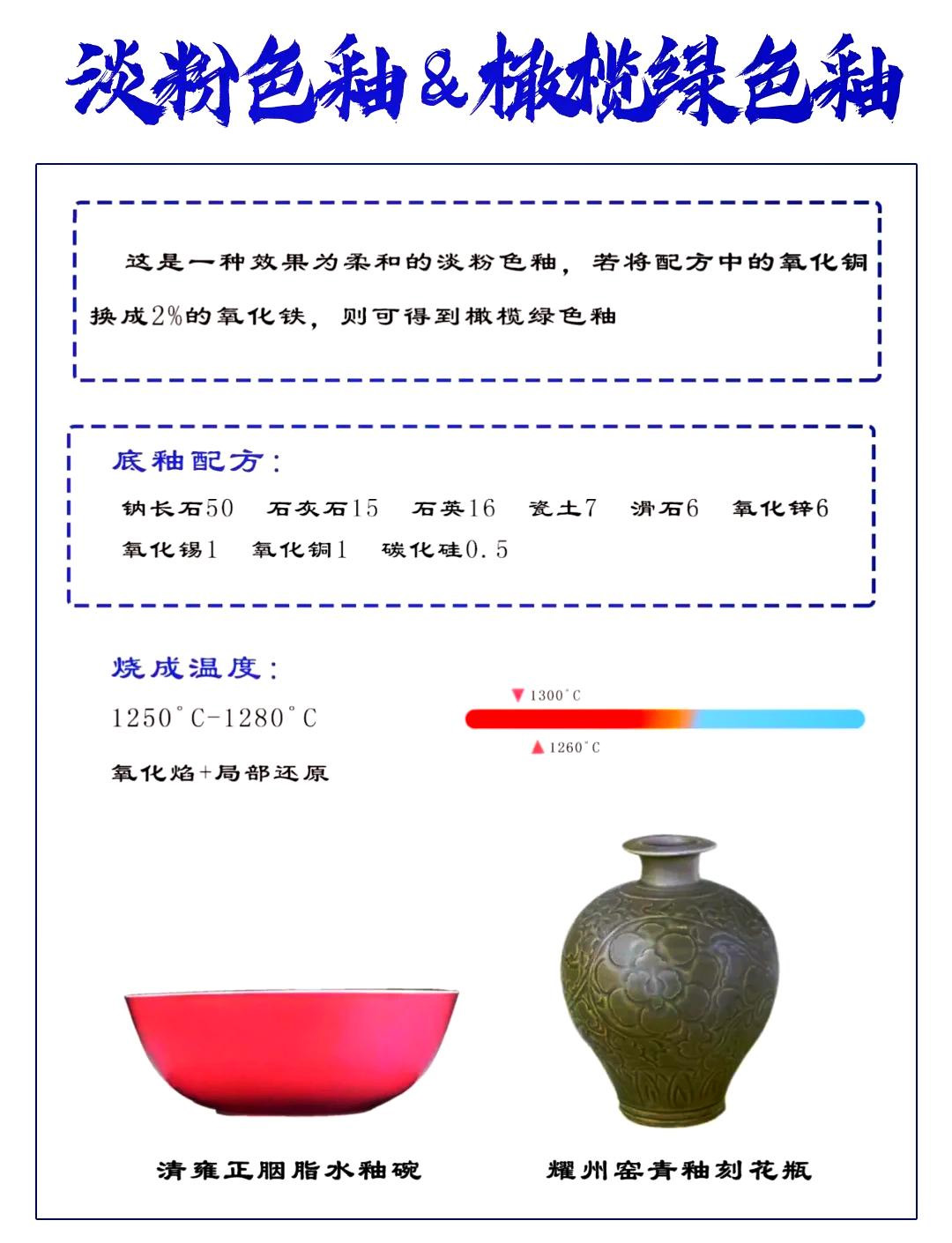 陶瓷的釉料配方 - 淡粉色釉和椒榄绿色釉 淡粉色釉 和 椒榄绿色釉:- 配方:石灰石15、钠长石50、石英16、瓷土7、滑石6、氧化锌6、氧化锡1、氧化铜1、碳化硅0.5- 烧成温度:1300°C- 效果:柔和的淡粉色或橄榄绿色釉,适合多种陶瓷制品。 赞 笔记 分享 欢迎访问:陶瓷笔记