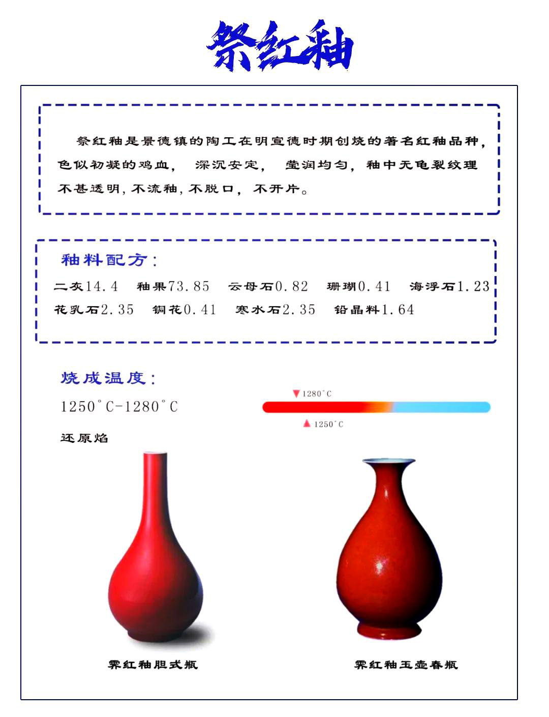 - 效果:色似初凝的鸡血,深沉安定,莹润均匀,适合高温烧制。