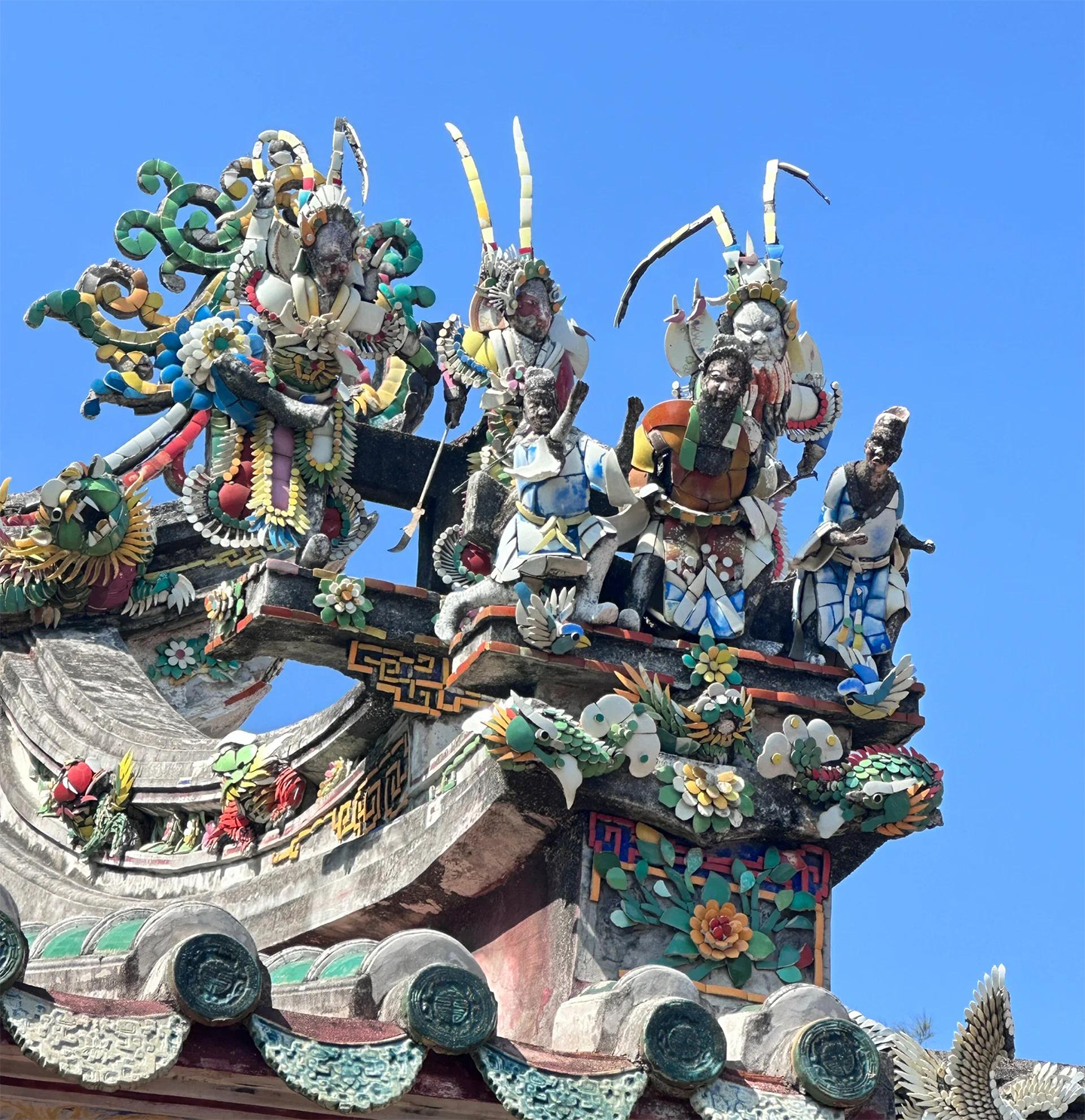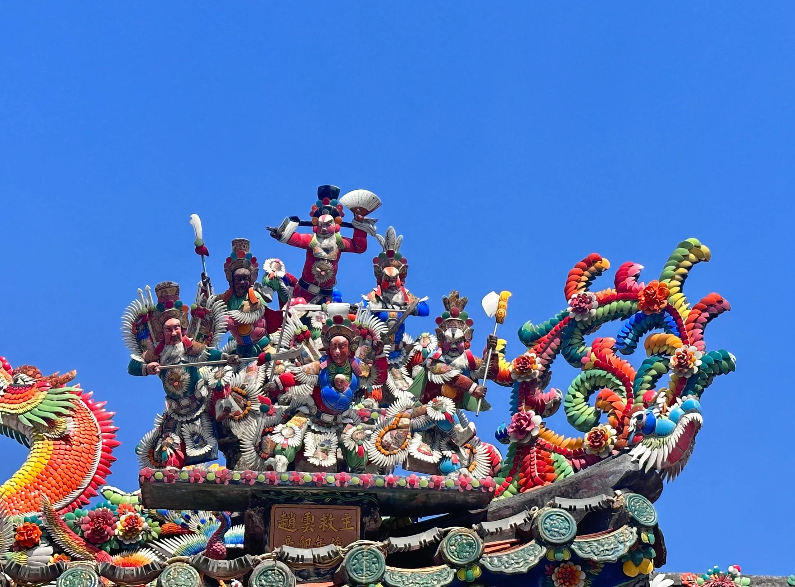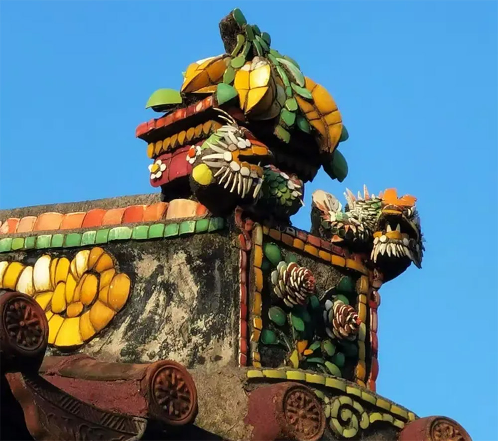 简单理解:嵌瓷就是用各种颜色的碎瓷片镶嵌在平面上形成图案,或是镶嵌在立体造型表面增加色彩。(瓷片以前是废弃瓷器的再利用,现在有专门设计生产。)