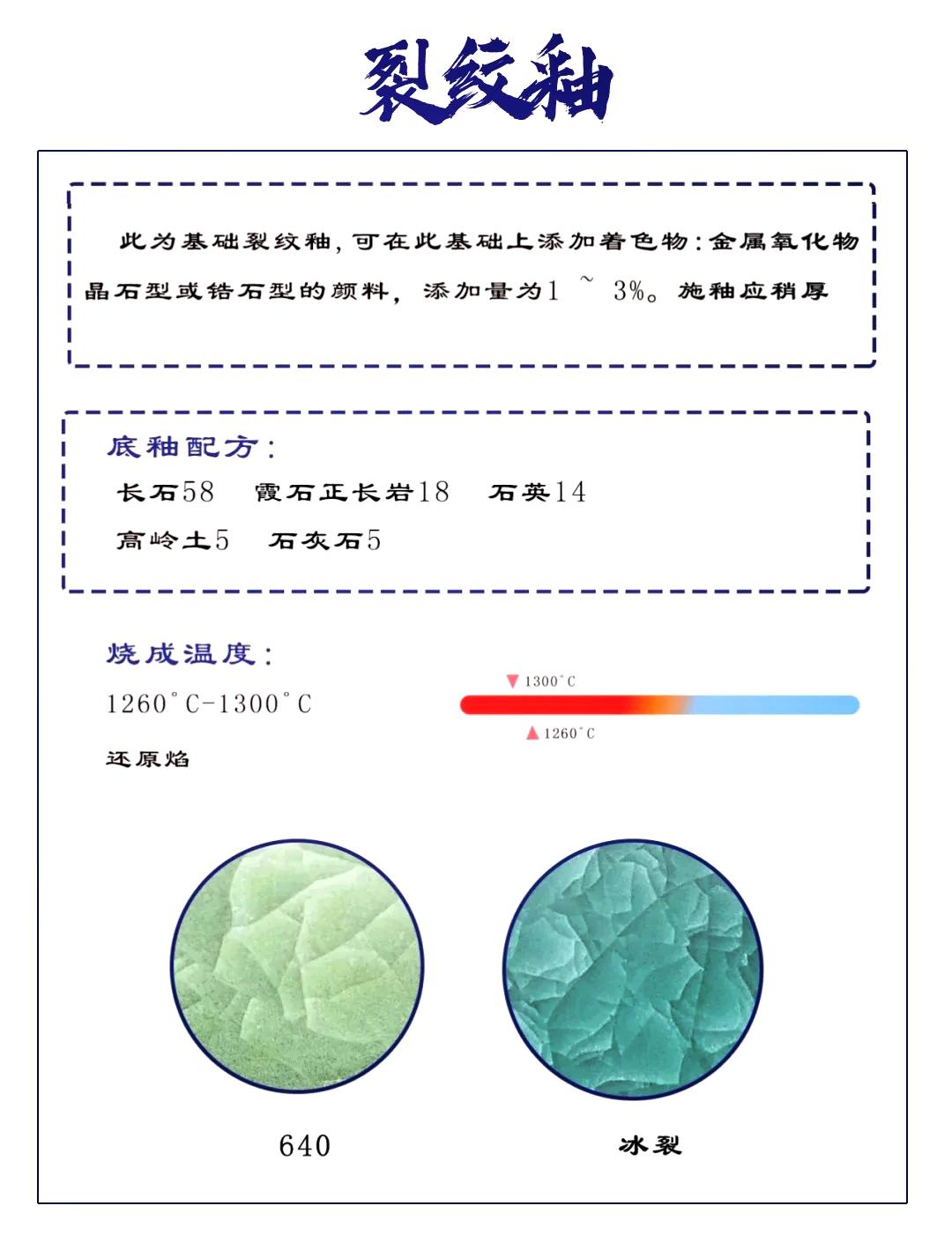 陶瓷的釉料配方 - 裂纹釉 裂纹釉:- 配方:长石58、霞石正长岩18、石英14、高岭土5、石灰石5- 烧成温度:1300°C- 效果:可添加金属氧化物或晶石型颜料,形成独特裂纹效果。 赞 笔记 分享 欢迎访问:陶瓷笔记