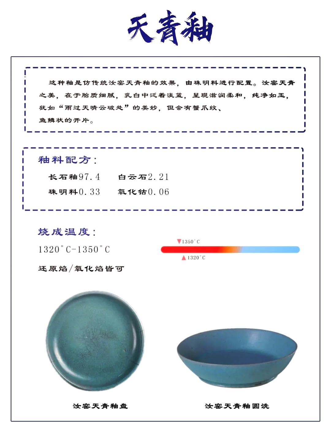 陶瓷的釉料配方 - 天青釉 天青釉:- 配方:长石釉97.4、白云石2.21、珠明料0.33、氧化钻0.06- 烧成温度:1350°C- 效果:仿传统汝密天青釉,乳白中泛着淡蓝,滋润柔和,纯净如玉。 赞 笔记 分享 欢迎访问:陶瓷笔记
