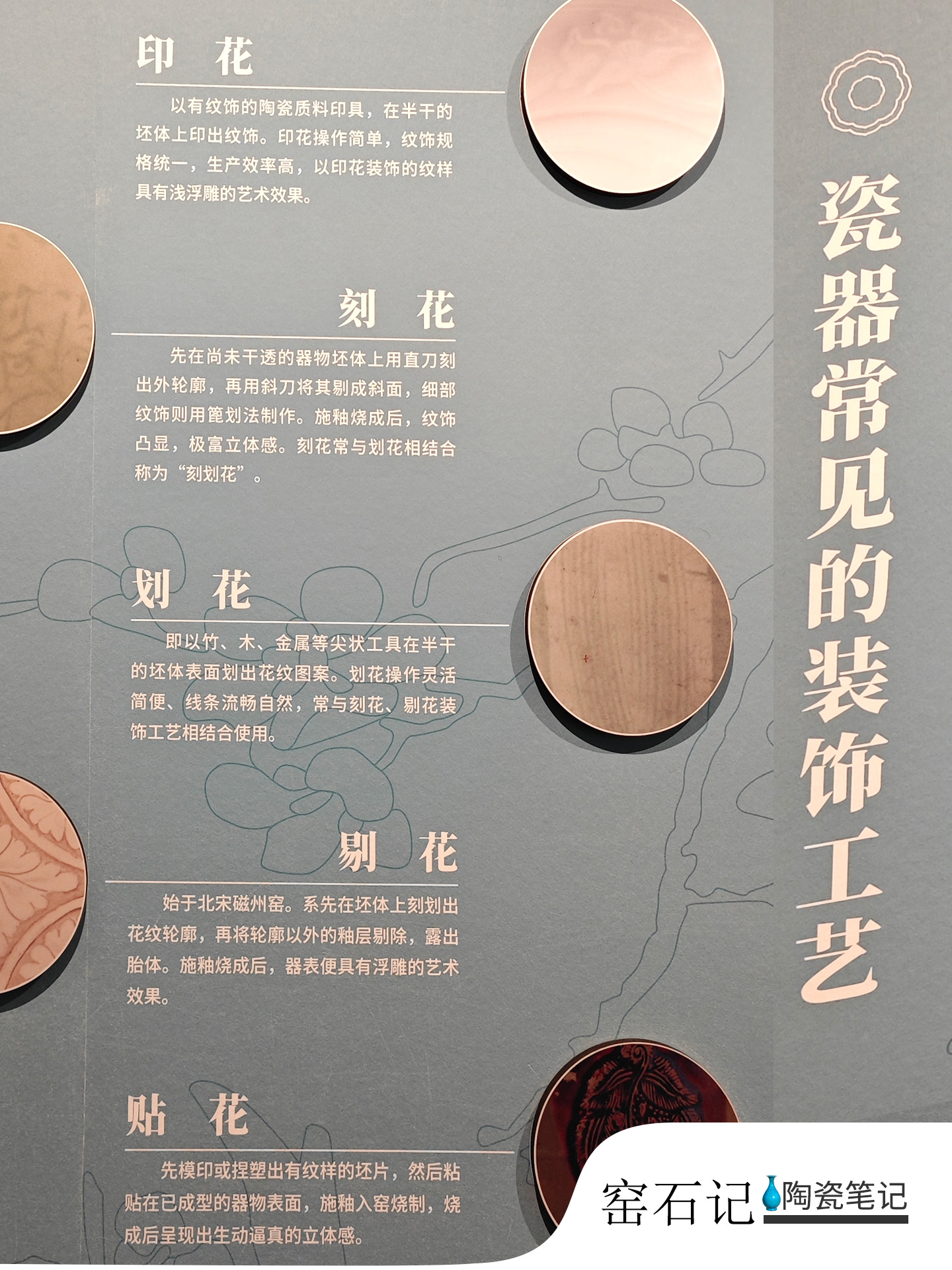 以有纹饰的陶瓷质料印具,在半干的坯体上印出纹饰。印花操作简单,纹饰规格统一,生产效率高,以印花装饰的纹样具有浅浮雕的艺术效果。
