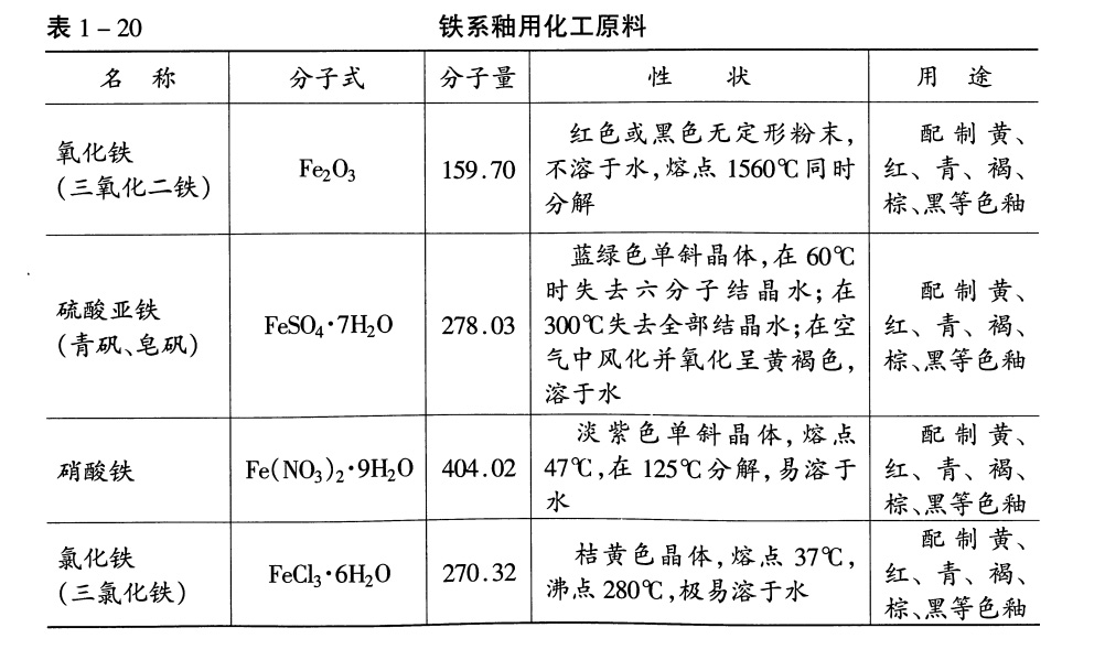 铁的化合物 铁的化合物能配制黄、红、棕、褐、青、黑等色釉。
