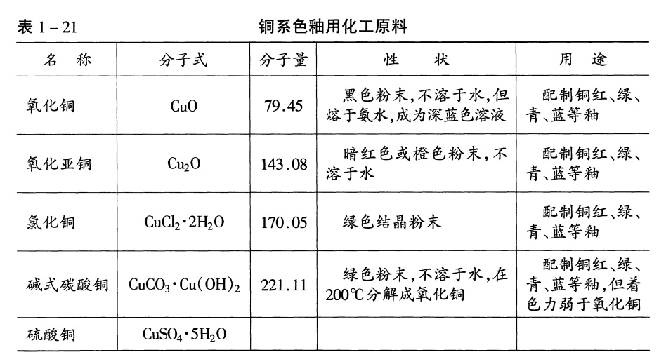 铜的化合物 铜的化合物能配制红、绿、青、蓝等色釉。宋代创造的铜红釉开始用铜矿石作着色釉,以后采用铜器加工过程中的铜屑(又称铜花)。