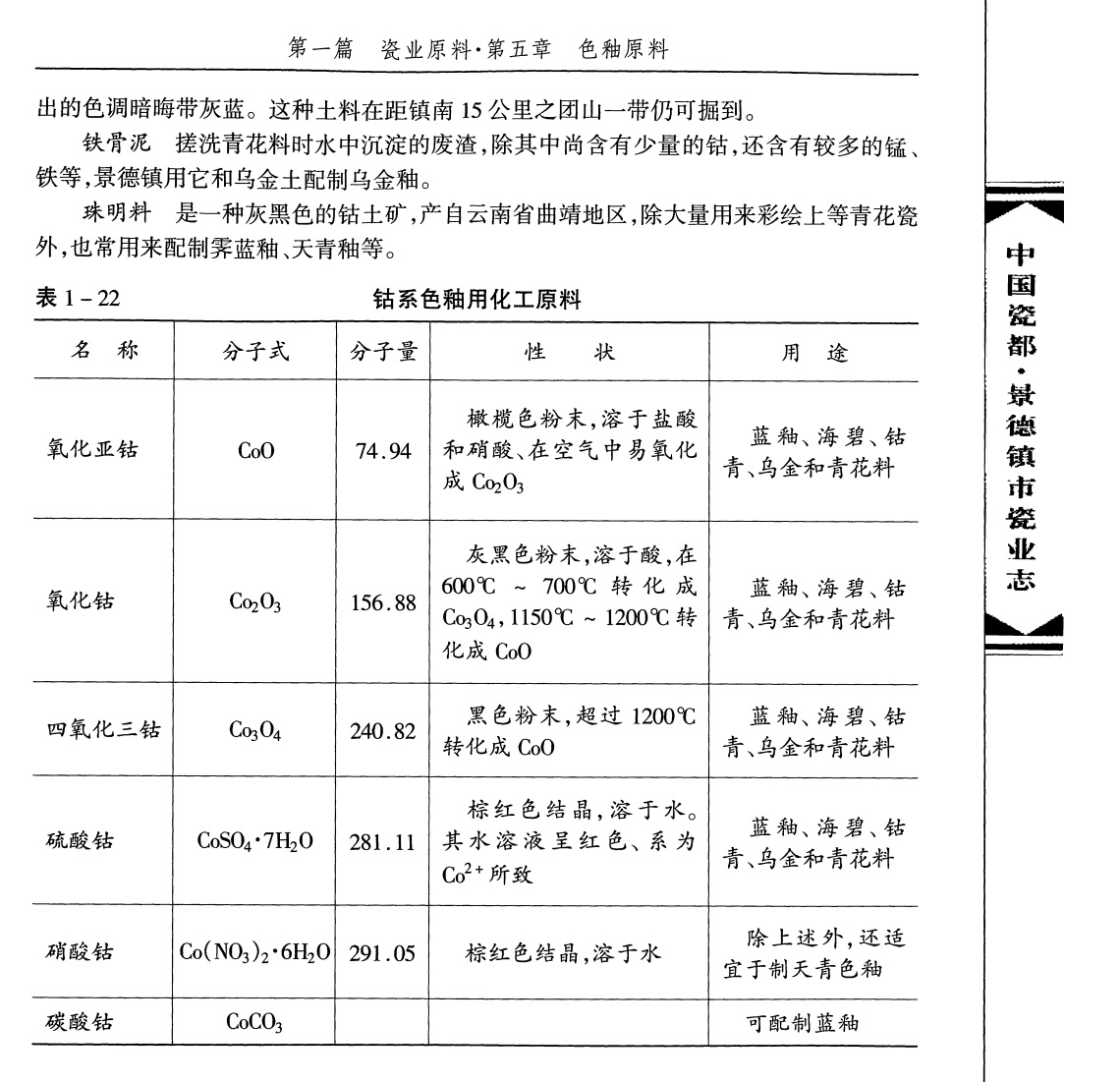 钴的化合物 钴的化合物能配制蓝、绿、黑、褐等色釉。中国钴矿以氧化锰为主要成份,钴含量很少,并含有其它金属氧化物。由于钴矿成分复杂,烧成温度及火焰性质对呈色变化也很大。