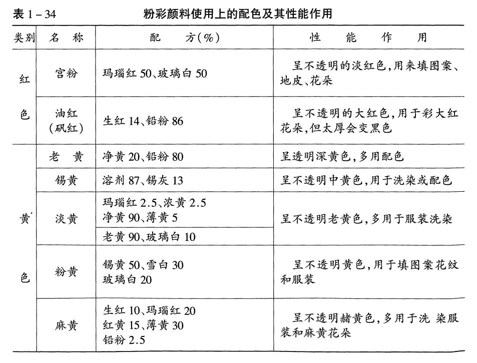 2.不透明的粉质颜料:这类颜料基本上含玻璃白成份,粉质感较强,仅作单线平涂用,不以复盖线条,只能在轮廓内充填,而且要求填得均匀,有一定的厚度故又叫“充填色料”,有粉翡翠、松绿、粉黄、宫粉、淡翠、雪景玻璃白、地皮黑料、地皮麻料、地皮绿、辣椒红等颜料。
