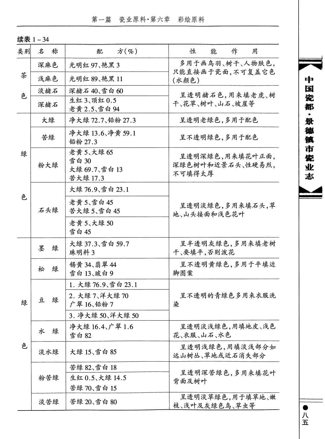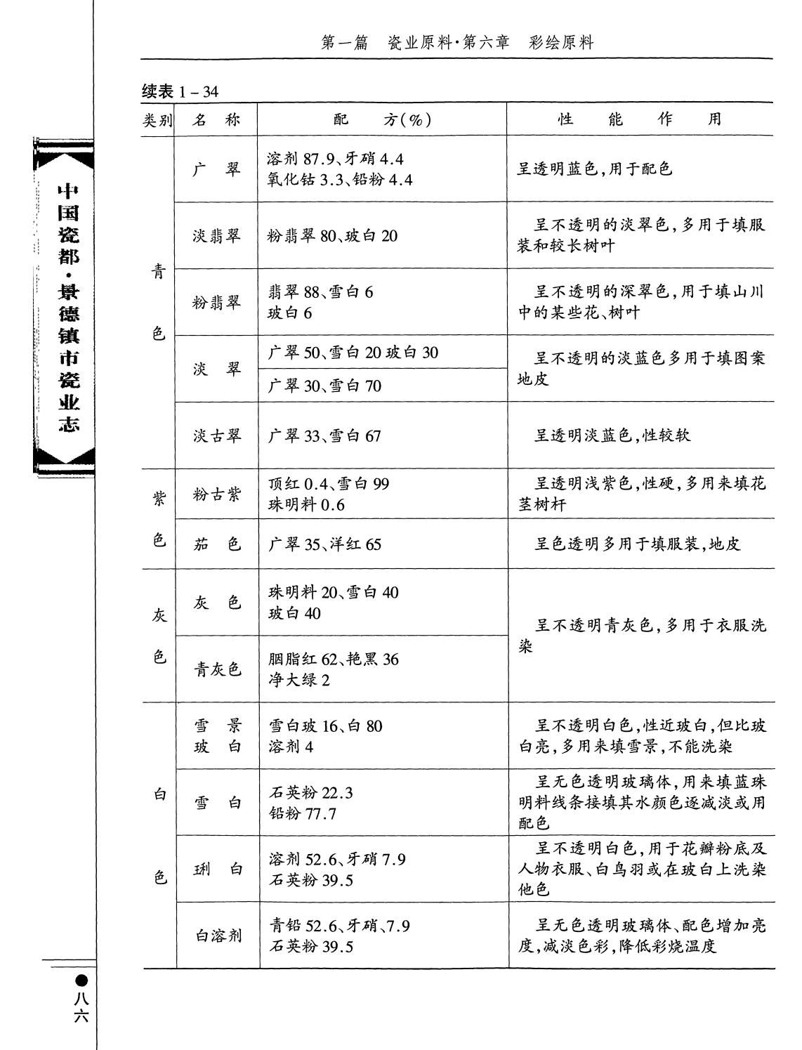 1.透明颜料:其性质就像玻璃一样,烤烧后能透出底色,下面的料底又可衬托上面的颜料更有内彩,因为这一类颜料是复盖在生料底上,故又叫“复盖色料”。有雪白、粉大绿、粉苦绿、水绿、赭色、粉古紫、淡翠和熔剂等。