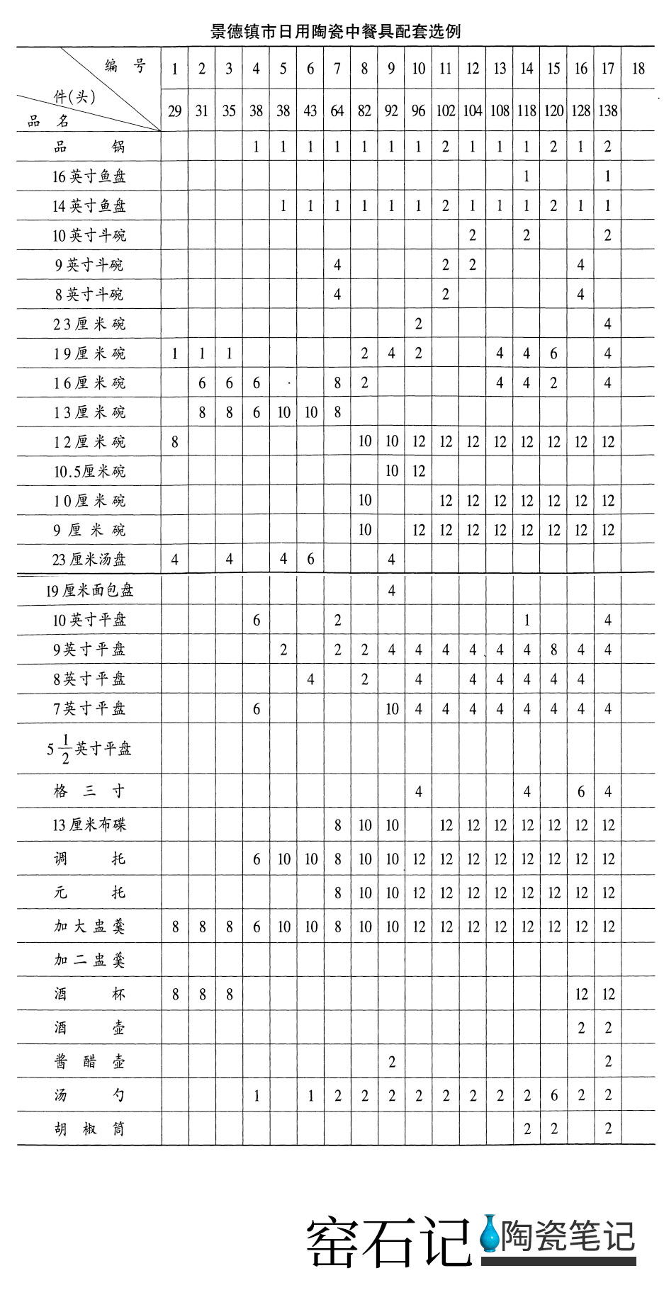 54头中餐具 配件有尺二鱼盘1块、8英寸汤盘6块、8英寸平盘4块、10英寸平盘1块、汤碗10只、3英寸碟10块、针匙10根、石榴令盅10只、二号品锅1只、大饭匙1根。49头民族餐具根据少数民族的生活特点进行设计的,全套餐具共由饭碗、汤碗、石榴饭碗、石榴汤碗等组成。