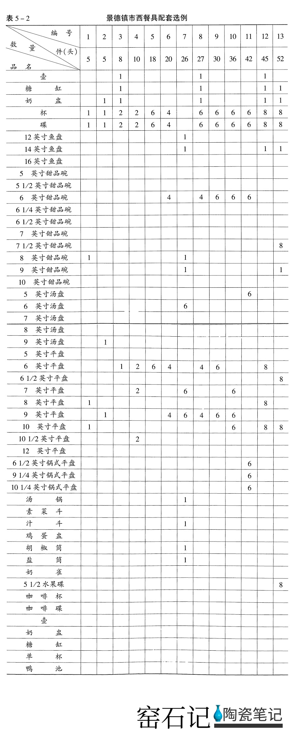 西餐具 根据国外市场用瓷情况进行设计,一般西餐具造型较固定,主要更新变化在杯、碟、糖缸、壶等品种上。由于西餐主、副食除少量的饮料等液体食品外,很少有带汤汁的,且热食较少。因此,配套器皿大都为盘类,而且多属浅式一乎盘,足圈也较中餐具低,其配套品种中分个人专用(分食)、共食器皿两类。个人专用器皿有:餐盘、汤盘、面包盘、沙拉子碗或沙拉盘等。共同器皿有咖啡壶、糖缸、汤锅、汁斗、素菜斗(鸭碗)、椭圆形长盘等。以92头、57头、45头、20头、5头为多。配套品种除壶、杯、碟、汁头、汤锅、餐盘等专用外,其他品种大小尺寸的选用按习惯和需要选择,较灵活,并不固定。