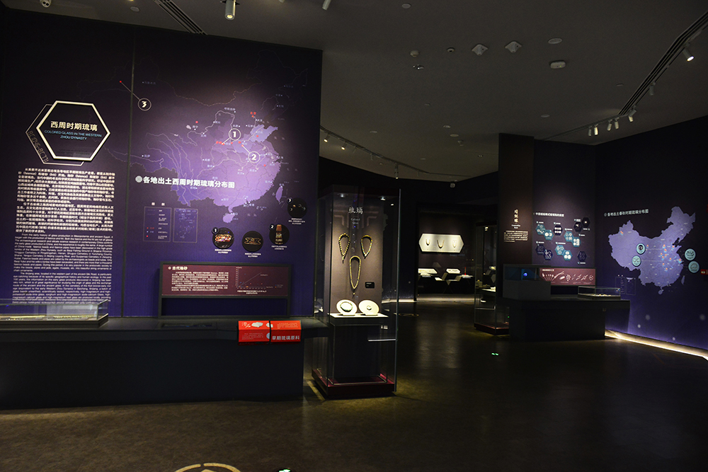 西周时期,贵族社会热衷于将琉璃与玉石、玛瑙、贝壳等连缀成美丽的饰物进行佩戴,五色厅展示的费昂斯(英文音译,意为“釉砂”)串饰即是此时期的琉璃产物。
